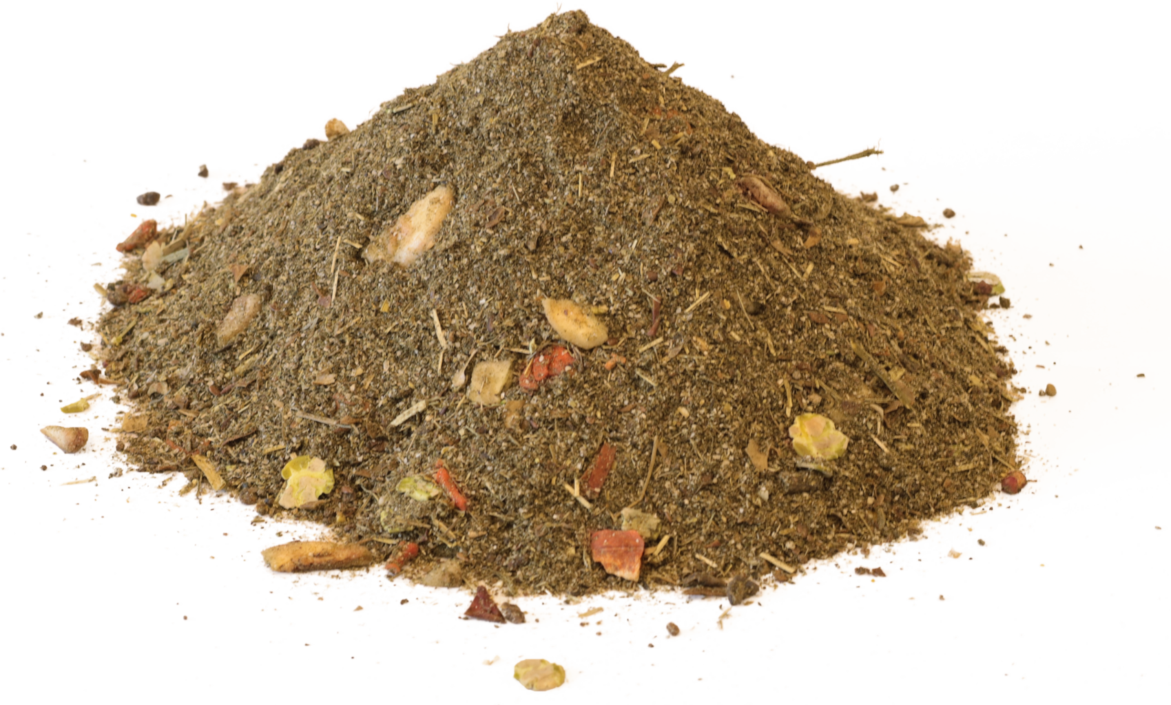 zöldliszt, borsóhéj, napraforgódara, almatörköly, lenmag (hőkezelt), őrölt réti széna (timothy fű), repceolaj, Repcepogácsa takarmány aprított szárdarabokkal”, sörélesztő, borsópehely, szárított sárgarépa, maerl (tengeri alga mész), banánchips (mézzel bevont), nátrium-klorid, kalcium-karbonát