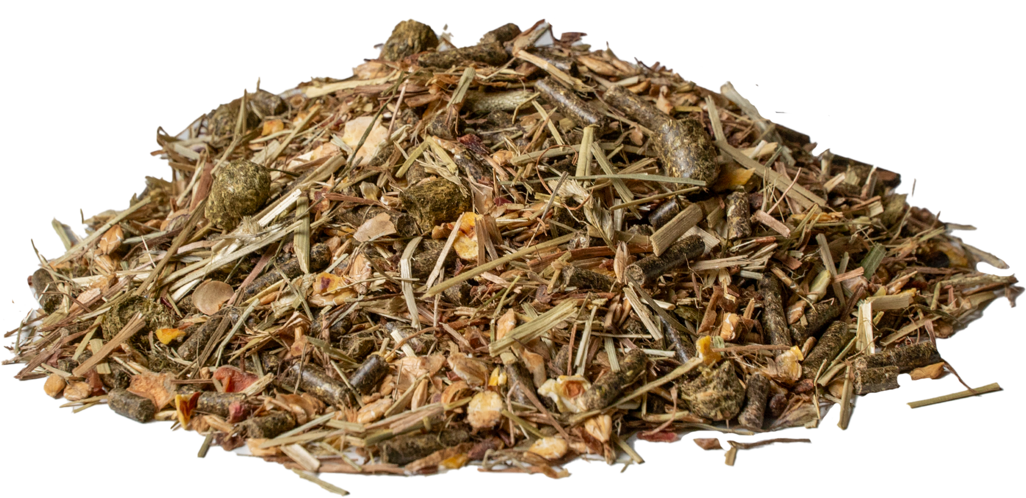 zöldliszt, árpapehely, napraforgódara, almatörköly, kukoricapehely, búzakorpa, réti széna (timothy fű), zöld zab, repceolaj, száraz darálék, zabkorpa, lenmag (hőkezelt), borsópehely, maerl, szárított sárgarépa, kalcium-karbonát