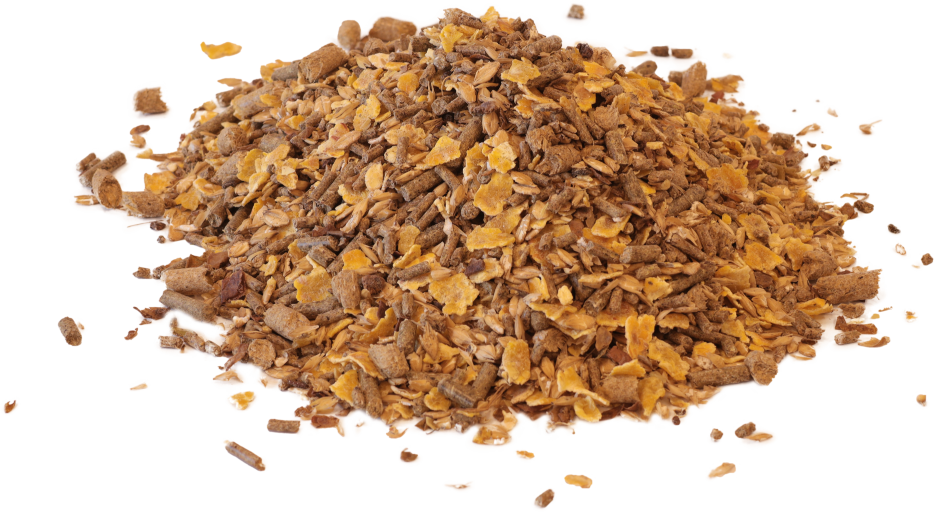 kukoricapehely, zabkorpa, búzakorpa, árpapehely, hengerelt árpa, árpa, almatörköly, cukornádmelasz, száraz darálék, zöldliszt, kalcium-karbonát