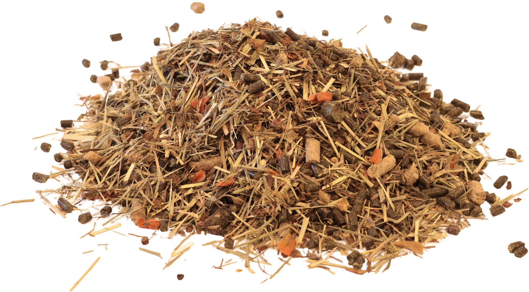 zöldliszt, zabkorpa, réti széna (timothy fű), almatörköly, lenmag (hőkezelt), Repcepogácsa takarmány aprított szárdarabokkal”, repceolaj, napraforgódara, sörélesztő, maerl, szárított sárgarépa