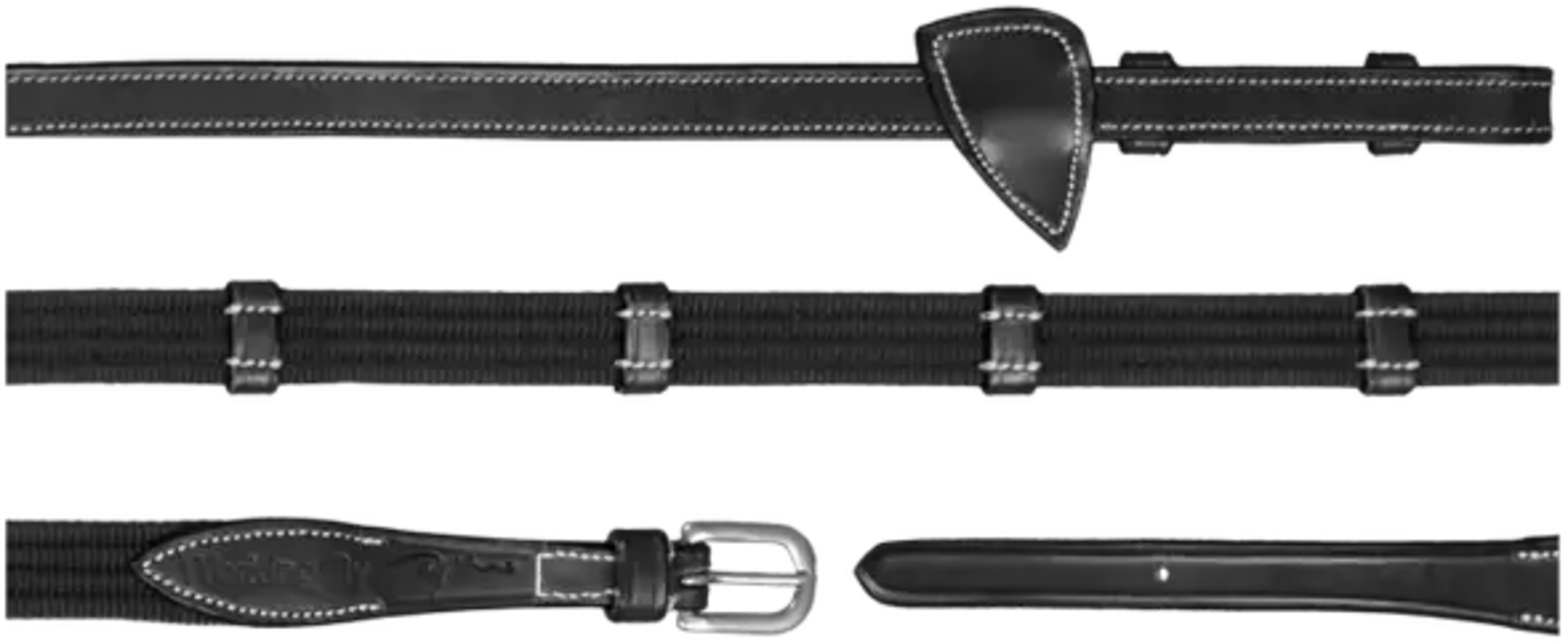 Klasszikus, anatómiailag formázott szár, amely extravagáns módon robusztus bőrrel kombinált és világos varrásokkal díszített. A csomag tartalma a Martingál stopp és 9 darab bőrből készült osztást.