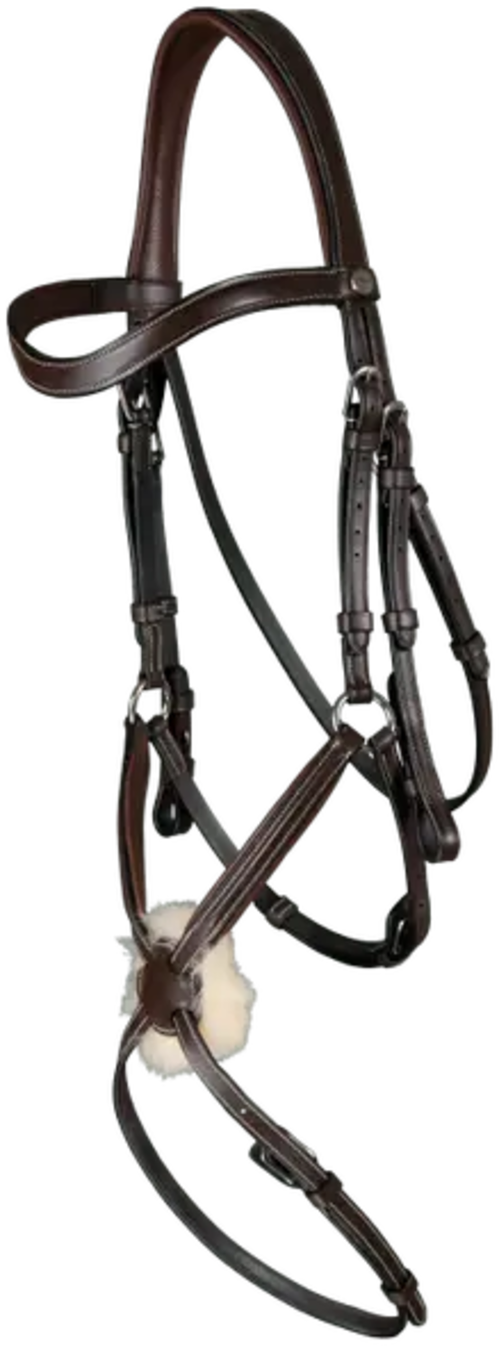 Mexikói orrpánttal ellátott kantár klasszikus megjelenéssel. A kiváló minőségű bivalybőrből készült termék különösen puha és simulékony V-alakú homlokszíjjal, valamint enyhén szögletes, domborított orrszíjjal rendelkezik. Az orr-rész ezenkívül puha szőrmével bélelt, hogy még jobban kímélje ezt az érzékeny területet. Krémszínű varrással díszített.