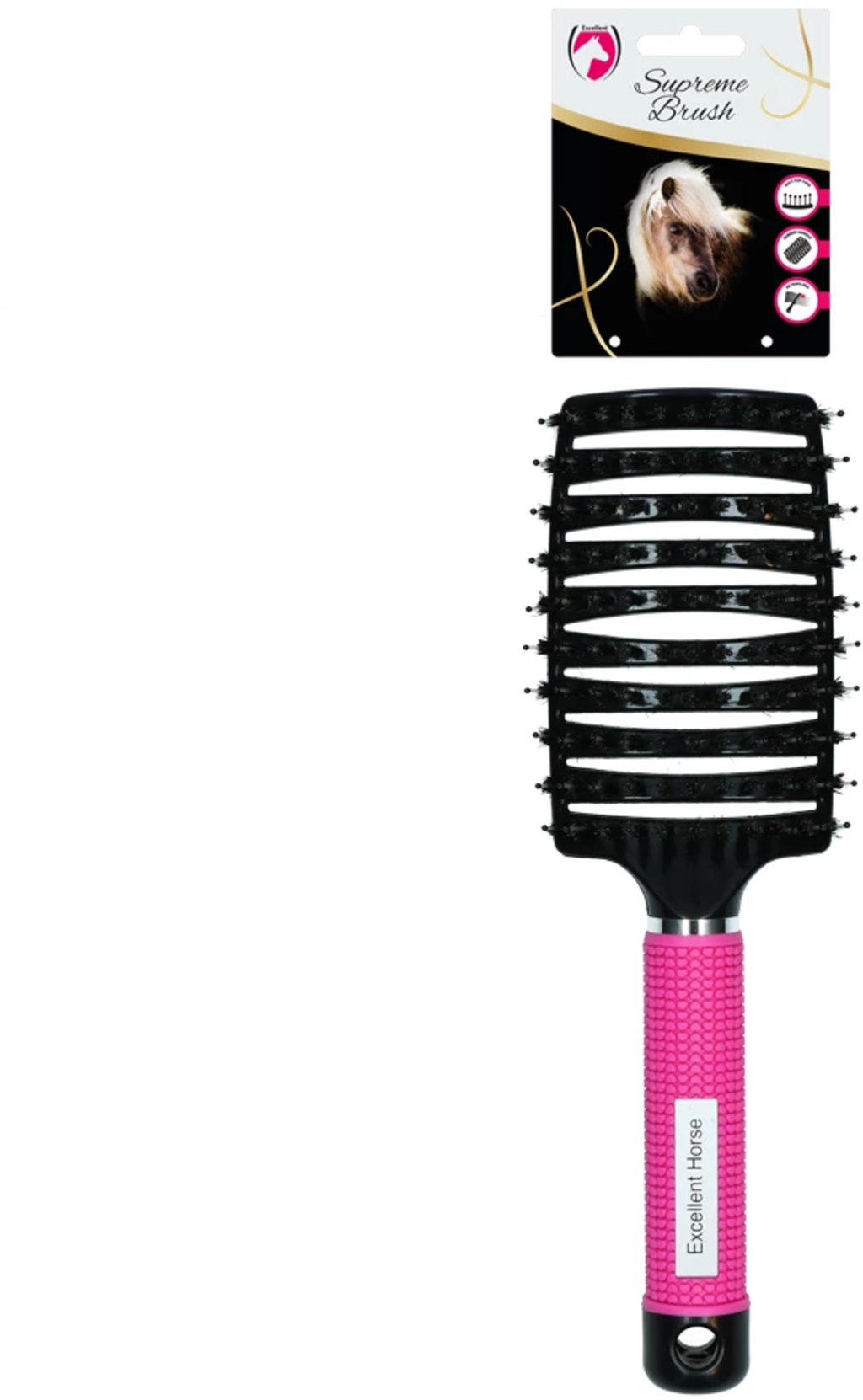 Az Excellent Supreme Brush segítségével erőfeszítés nélkül érhet el fényes és ápolt megjelenést lova számára. Ez a speciális kefe eltávolítja a csomókat a farokból és a sörényből, valamint megelőzi a szőrvégek töredezését, így a szőrzet mindenkor ápolt marad.