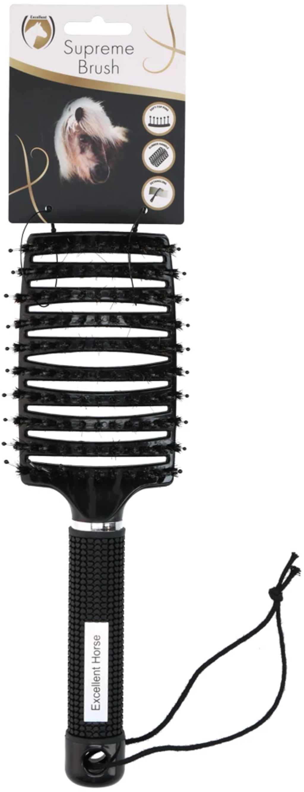Az Excellent Supreme Brush segítségével erőfeszítés nélkül érhet el fényes és ápolt megjelenést lova számára. Ez a speciális kefe eltávolítja a csomókat a farokból és a sörényből, valamint megelőzi a szőrvégek töredezését, így a szőrzet mindenkor ápolt marad.