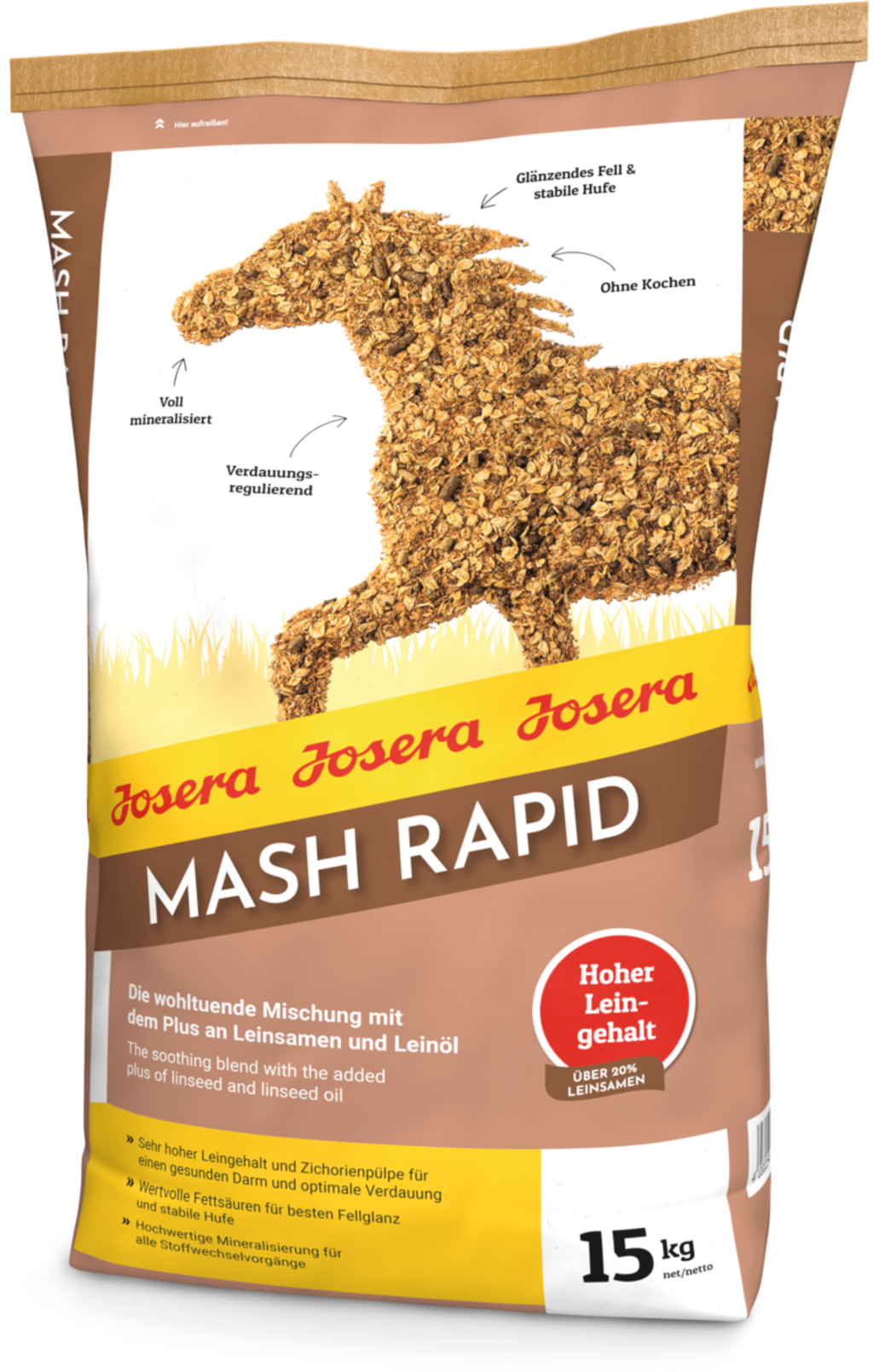 A Mash Rapid gyomorbarát összetevők gondosan megtervezett formuláját tartalmazza, amelyet kifejezetten a szőrzet, a bőr és a paták támogatására fejlesztettek ki. Ezért a Mash különösen alkalmas etetésre az átmeneti időszakokban a szőrzetváltáskor. A lenmag magas aránya, búzakorpával, árpával és almatörköllyel kombinálva képezi ennek a kiegészítő takarmánynak az alapját. Az extrudált, előkezelt lenmag miatt a Josera Mash Rapid-ot elegendő meleg vízzel felforralás nélkül kell összekeverni. A benne található nyálka a bélfalhoz tapad, ezért támogatja az ép emésztést és a bélmotoros működést.