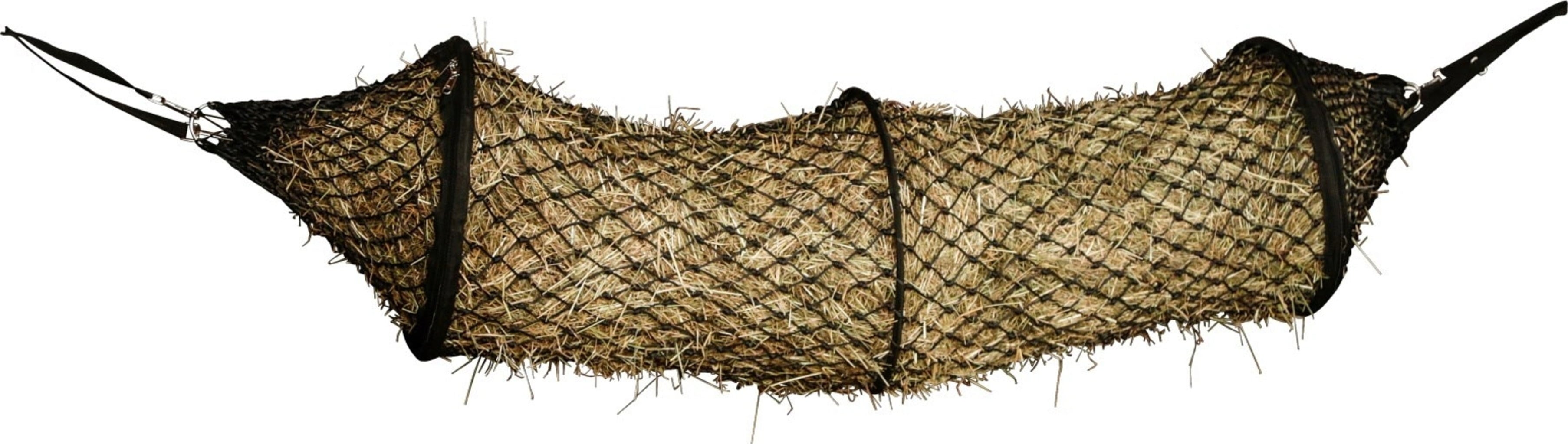 Az alagút alakú szénaháló a dupla rögzítésnek köszönhetően stabilitást biztosít. A háló mindkét oldalról tölthető.