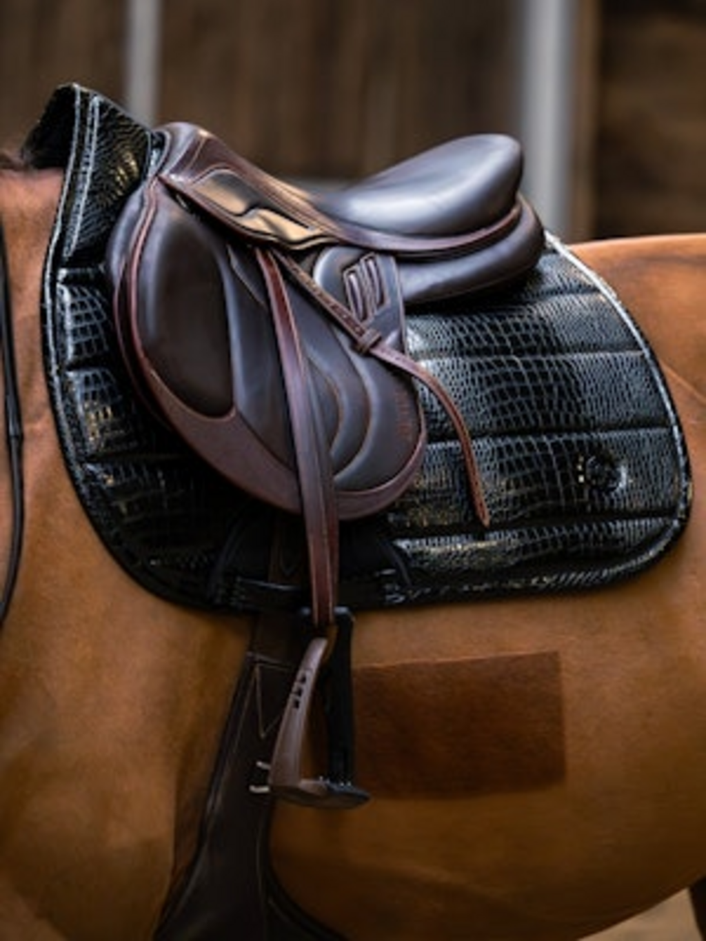 A Croco PU nyeregalátét segítségével exkluzivitást vihet a nyeregbe. A kiváló minőségű, elegáns krokodil-megjelenésű PU-anyagból készült termék egyesíti a stílusos designt a funkcionalitással. Az anatómiailag formázott szabásminta extra helyet biztosít a lónak a mar résznél, és minden mozdulatnál a legmagasabb szintű kényelmet garantálja.