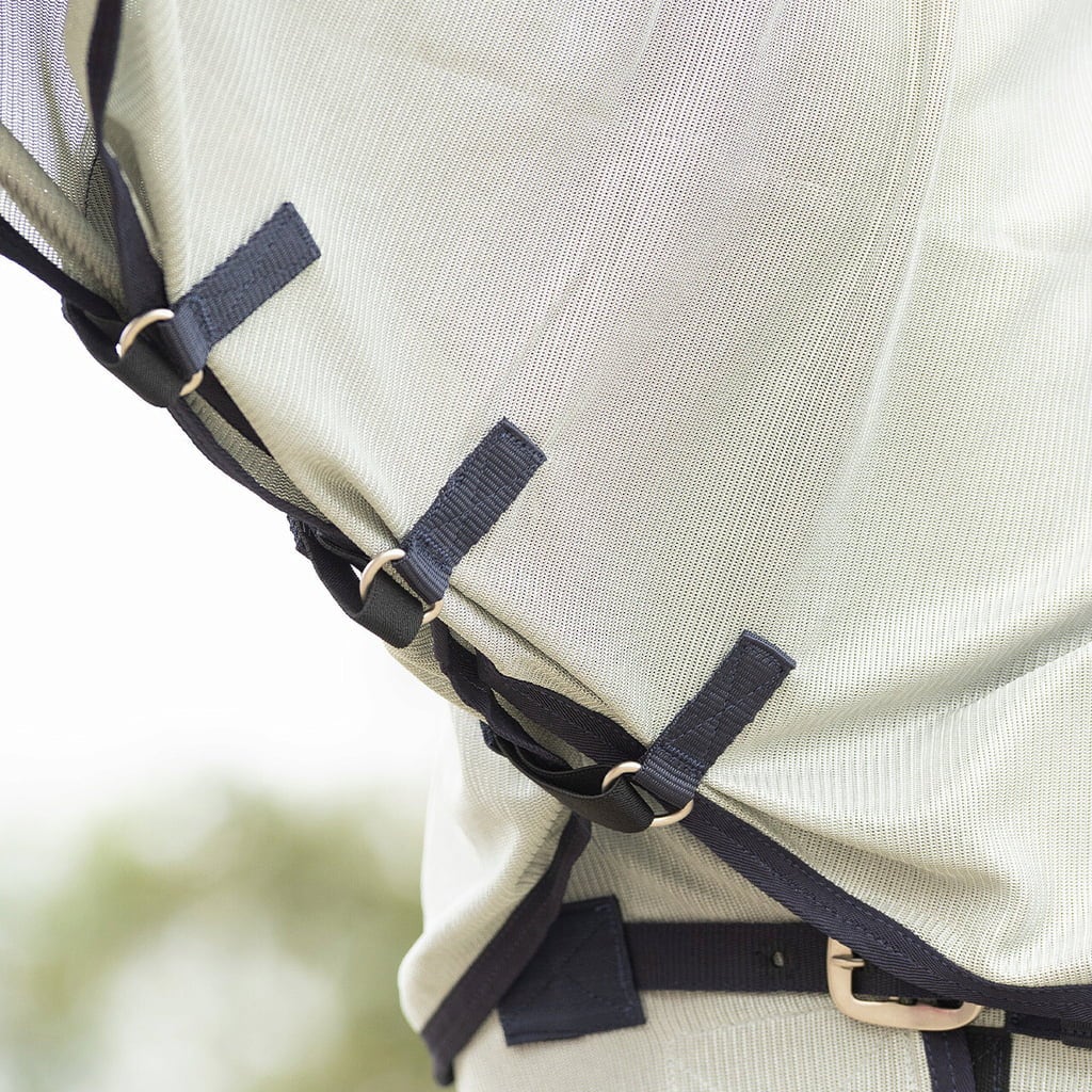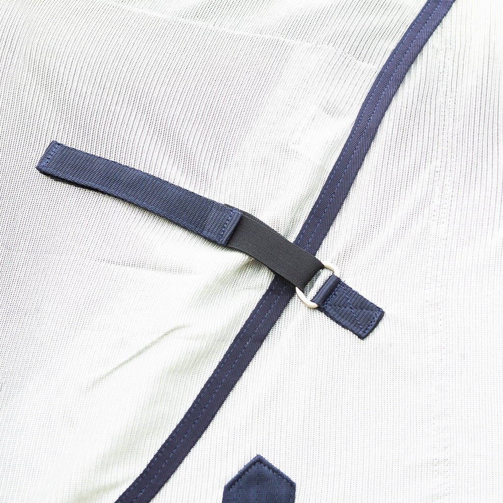 A takaró biztonságosan illeszkedik a mellkaspántnak, a járáshoz kialakított redőknek és a nagyméretű farokvédőnek köszönhetően. A nyak- és fejrész könnyen levehető, ha szükséges, így rugalmasan beállíthatja a védelmet lova igényeihez.