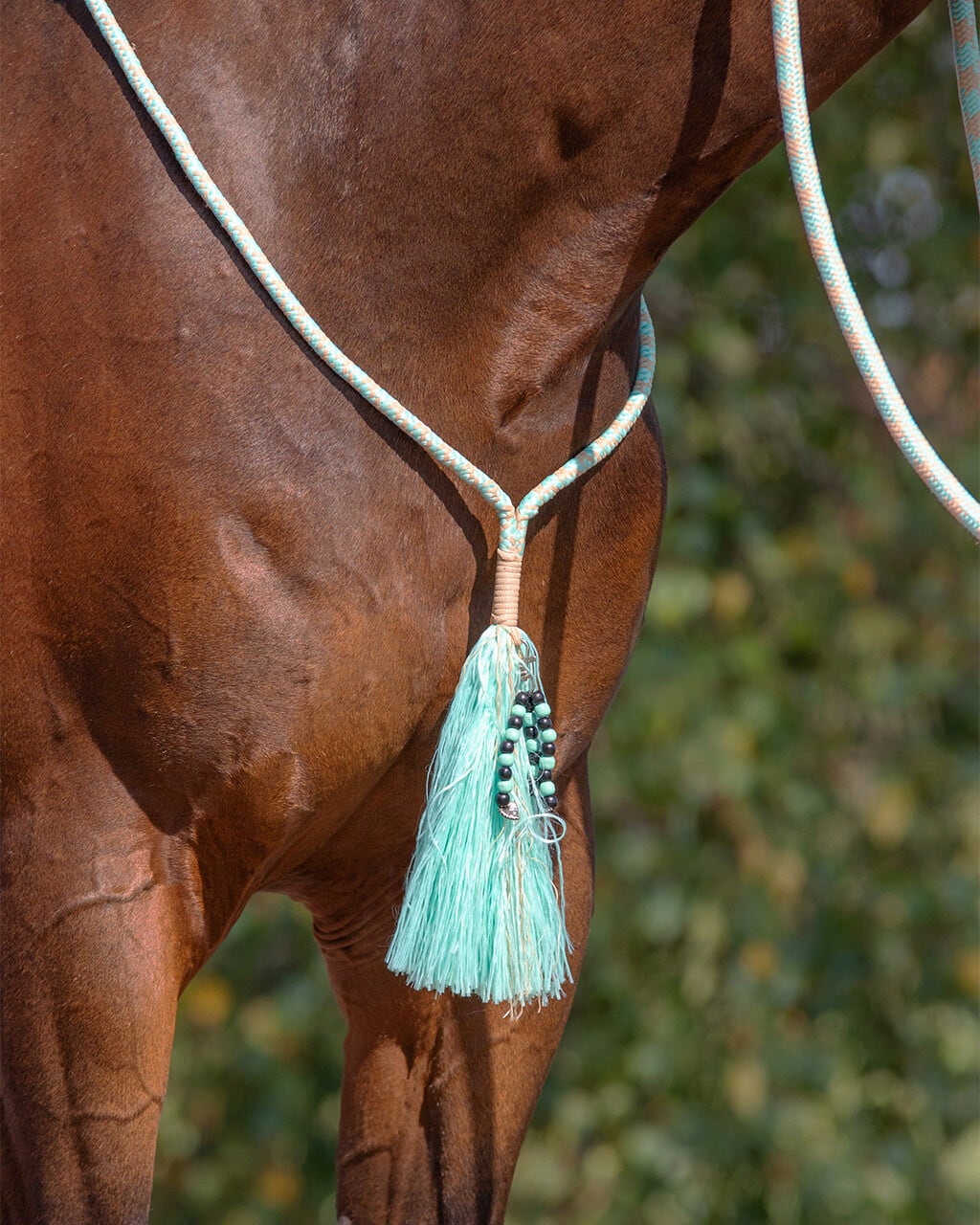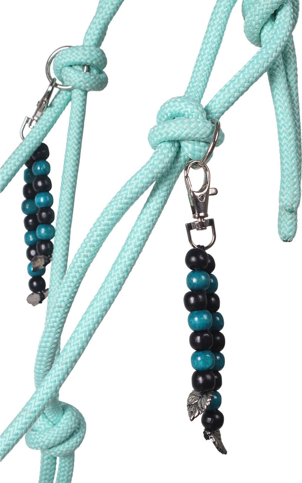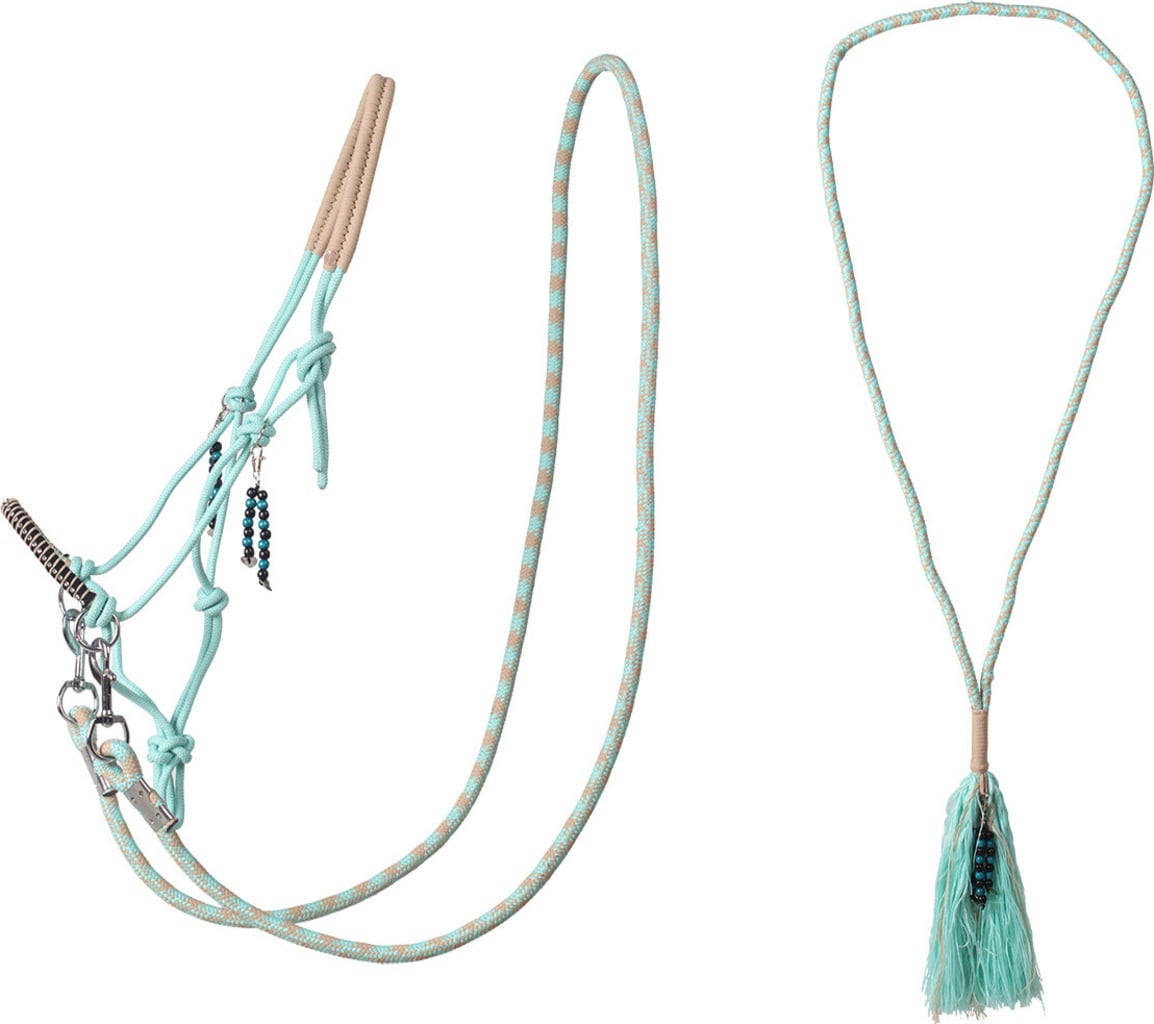 - 10 mm vastag kötélből készült csomózott kötőfék díszes orrszíjjal és fejrésszel