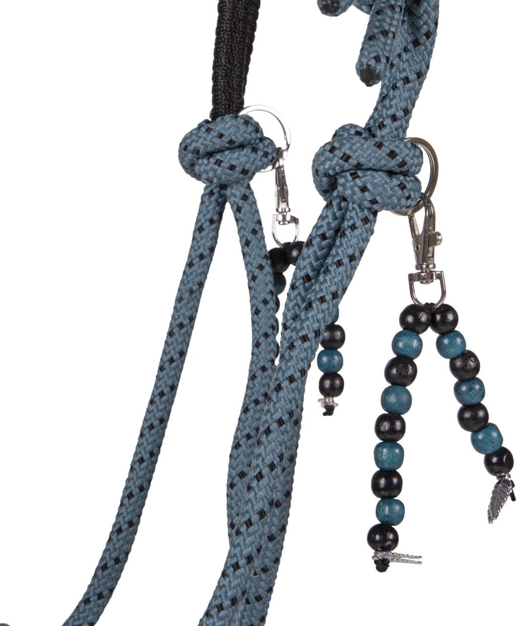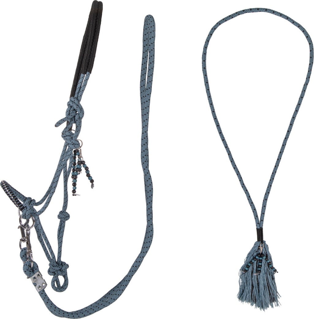 - 10 mm vastag kötélből készült csomózott kötőfék díszes orrszíjjal és fejrésszel