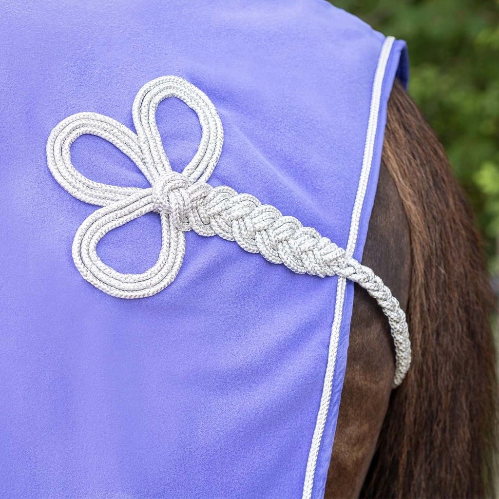 Az elegáns ezüst zsinór és a stílusos díszítés luxus megjelenést kölcsönöz a takarónak – ideális istállókba vagy versenyekre.