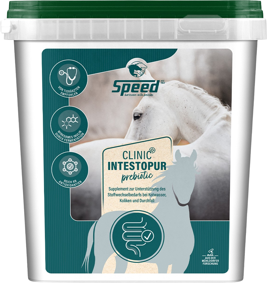 Fedezze fel a SPEED Clinic Intestopur Prebiotic terméket, egy speciálisan kifejlesztett formulát lovának, akinek különleges emésztési igényei vannak. Az összetétel alapját fermentált csicsókalé-koncentrátum adja, amely természetes módon gazdag inulinban, valamint szőlőmaglisztet és homoktövis törkölyt is tartalmaz. Ezek a gondosan válogatott összetevők segíthetnek lovának hatékonyabban hasznosítani a takarmányt, és jól beilleszteni az etetési rutinba.