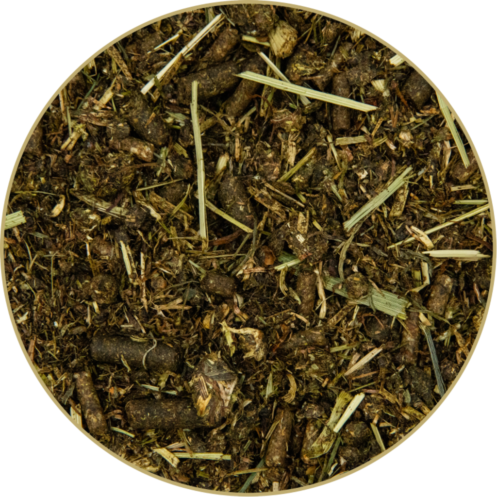 nagy változatosságú fű- és gyógynövények helyi rétekről, lucerna, zabkorpa, búzakorpa, szárított répaszelet, hidegen sajtolt olajkeverék (lenolaj, napraforgóolaj), PalaSyrup (izomaltulóz melasz), finomra tört olajos magvak és olajpogácsa-keverék (lenmag, napraforgómag, feketekömény mag), kukoricacsíra, kalcium-karbonát (tengeri és ásványi), rizskorpa, répacukor, gyümölcstörköly (alma, szőlő), nátrium-klorid, gyógynövények (borsmenta, édeskömény, kamilla, kakukkfű, rozmaring, csalán, görögszénamag), ecet, dikálcium-foszfát, maláta-élesztő kivonat (inaktivált fermentált maláta, inaktivált fermentált élesztő), napraforgó virág, búzavirág virág, fokhagyma, sörélesztő, vízmentes magnézium-oxid/-szulfát/-fumarát, minősített növényi takarmány szén, sárgarépa, kurkuma gyökér