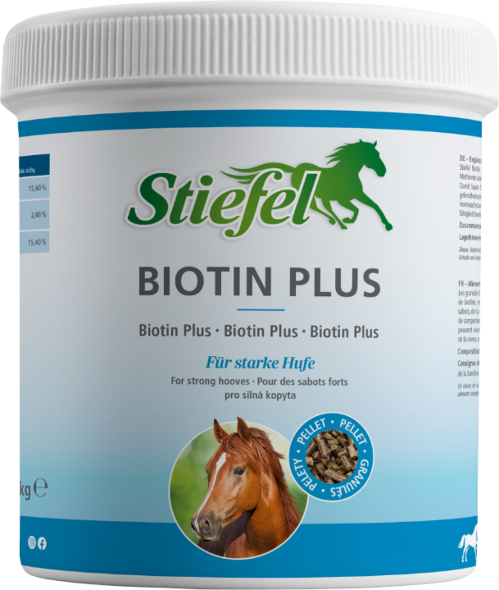 A Stiefel Biotin Plus Pellet biotinhiány esetén kerül az étrendbe, és a biotin, metionin és cink hatékony hármas formulájának köszönhetően javíthatja a ló patája és szaruja minőségét. Ha a ló biotinhiányban szenved, az negatív hatással lehet a pata és a szaru növekedésére, valamint rugalmasságára és ellenállóképességére. Emellett a szőrzet minősége is romolhat: hámló szőrzet és bőrirritáció lehet az eredmény.