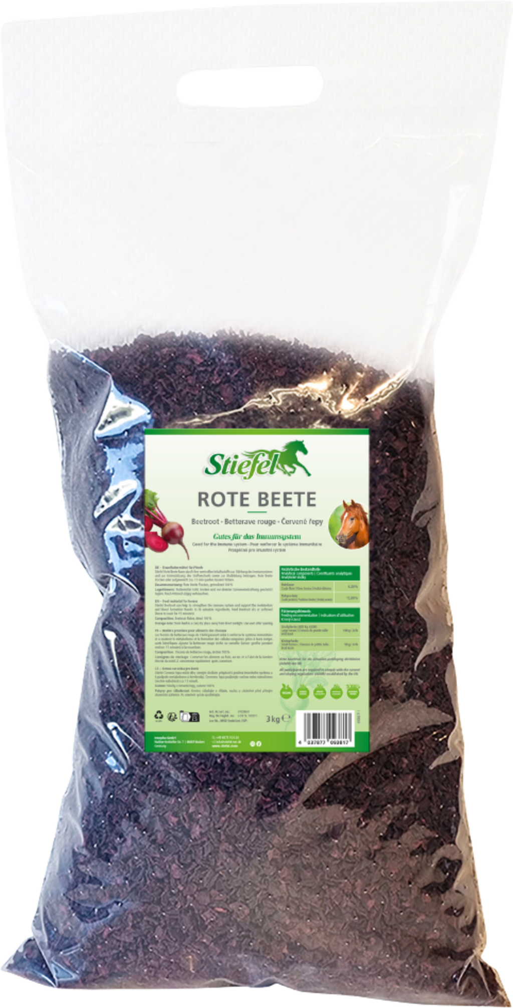 A Stiefel Céklapehely a C-vitamin, a vas, a folsav, a B-vitaminok, a kálcium és a betanin természetes forrása. A benne lévő betanin vörösre varázsolja a céklát. A cékla összetételénél fogva hozzájárulhat az immunrendszer erősítéséhez és az anyagcsere támogatásához, valamint a vérképzés javításához. A magas vastartalom és a betanin serkentheti a vérképzést és megelőzheti a vérszegénységet, valamnt támogathatja a regenerációt. A Stiefel Céklapehely kiegészítő takarmányként alkalmas a napi takarmányadag vas- és nyomelemtartalmának növelésére, ezáltal hozzájárul a szervezet saját védekezőképességének erősítéséhez.