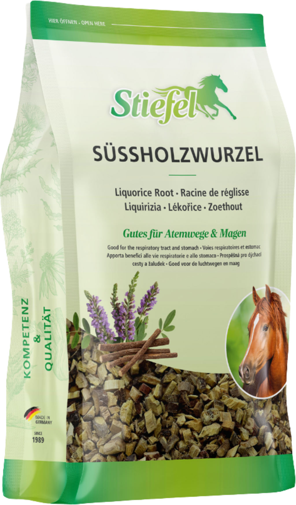 Az édesgyökér eredetileg a Földközi-tenger térségéből és Nyugat-Ázsiából származik. Az édesgyökérről azt mondják, hogy gyulladás- és duzzanatcsökkentő hatású. Állítólag pozitív hatással van a hörgőrendszerre is. A Stiefel Édesgyökér megkönnyíti a ló számára a makacs váladék felköhögését. A benne található édes anyagok serkenthetik a víz- és sóanyagcserét. Ezenkívül a Stiefel Édesgyökér pozitív hatással lehet a gyomor-bél traktusra, valamint enyhíti a görcsöket és a puffadást.