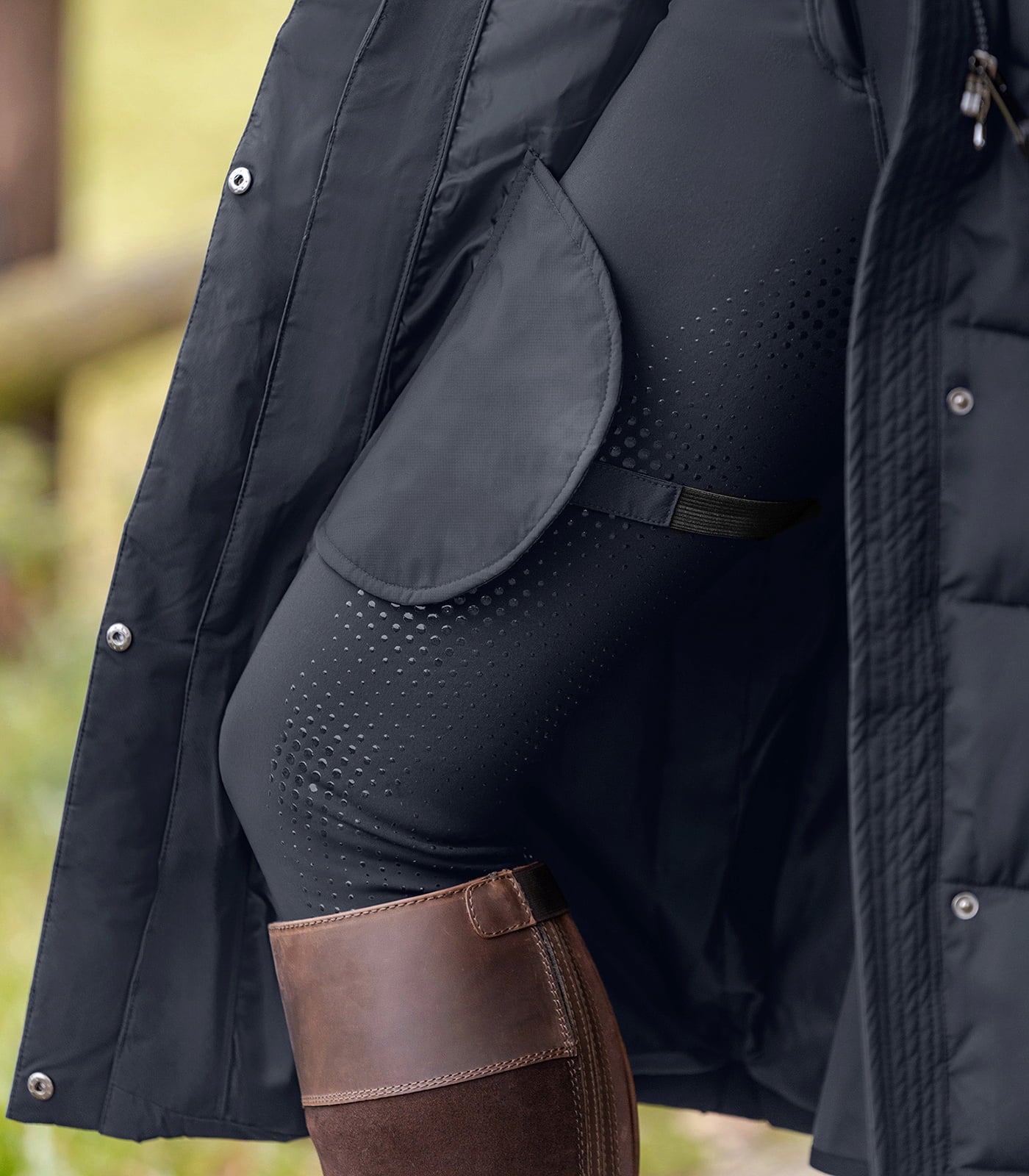 A kiváló minőségű, kétirányú cipzár elegáns fémhatású kivitelben igazi különlegesség a lovasok számára: a nyereg felett végződik, hogy védje az értékes bőrt. Az állítható lábpántok biztosítják, hogy a kabát tökéletesen illeszkedjen, még ügetés közben is. Esős időben pedig az egyébként levehető kapucni lehajtható napellenzővel szárazon tartja.